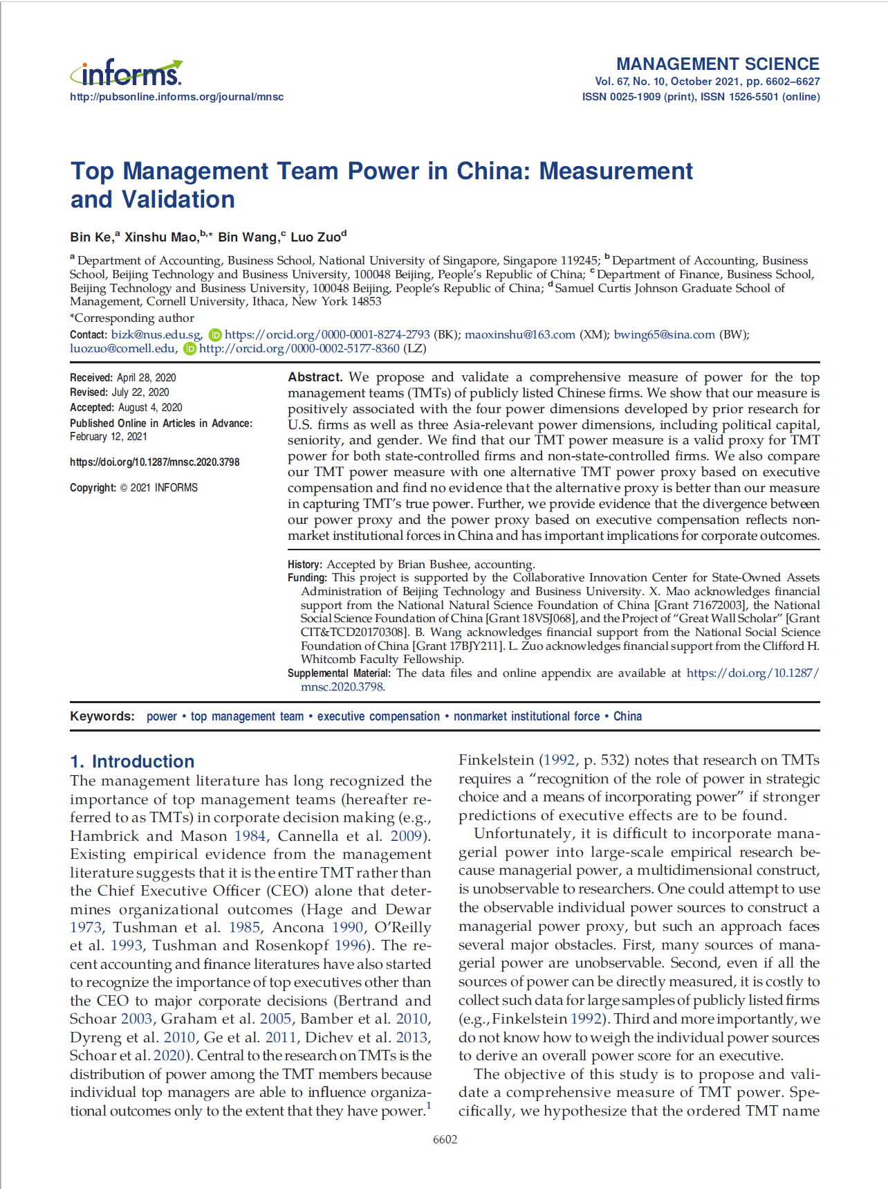 近日,我校商學院王斌教授、毛新述教授(通訊作者)與新加坡國立大學柯濱教授、康奈爾大學左羅教授的合作論文《中國公司高管團隊權力:測度與驗證》(Top Management Team Power in China: Measurement and Validation),在《管理科學》(Management Science)雜志正式發表。Management Science是國際公認的頂級管理學期刊,也是經濟管理類國際公認權威期刊目錄UT DALLAS 24本期刊之一。