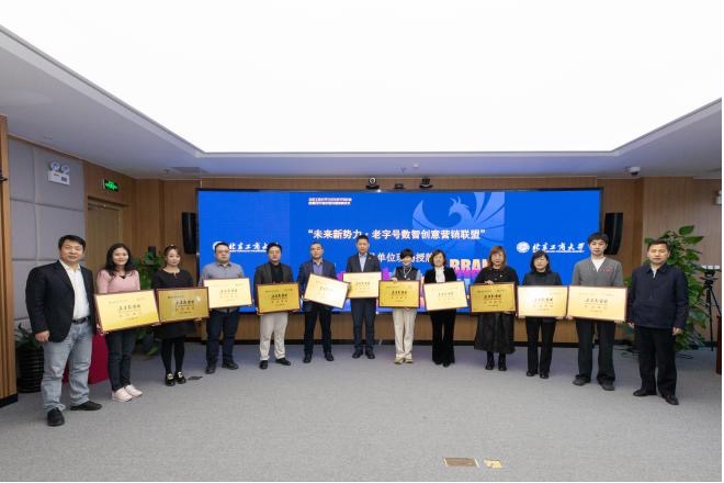 寇紅江與新商業經濟研究院院長周清杰為合作企業代表頒發“未來新勢力·老字號數智創意營銷聯盟會員單位”牌匾,北京工商大學招生就業處處長石松、副處長劉晶與教務處副處長蓋曉慶為企業代表頒發“大學生就業實習實踐基地”牌匾。
