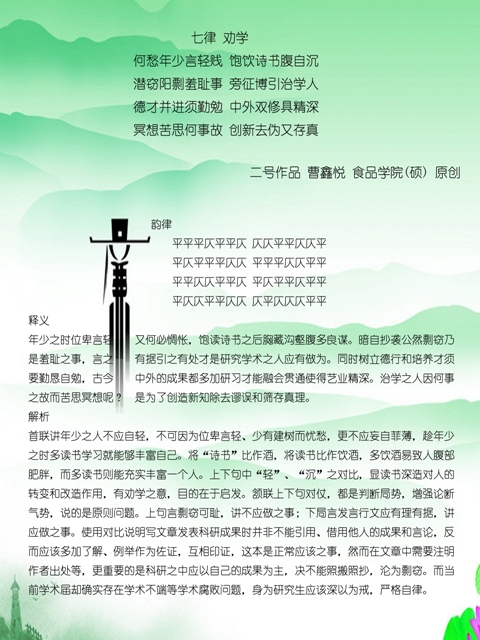 此次活動由我校青年廉潔自律促進會(簡稱“青廉會”)主辦,是面向全校學生開展的一次貼近學生學習、生活、思想的廉潔教育活動。4月21日至5月11日期間在全校學生中廣泛征集廉潔教育主題作品,共收到56份作品,其中本科生作品32份,研究生作品24份。作品內容包括抵制學術不端、考試誠信、廉潔自律等,形式包括海報、漫畫、詩歌、劇本、宣傳語、書法、剪紙等。其中既有原創作品,也有根據網絡素材改編的作品。經過兩周作品展示收到觀眾投票152票,微博投票1251票,微博轉發148次,共選出圖畫類和文字類入圍作品各10份。