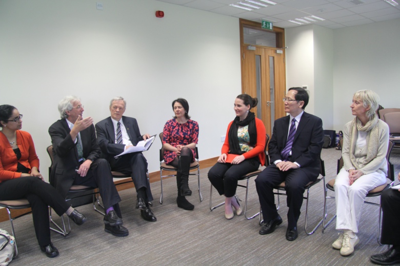在愛爾蘭考克大學(xué),譚校長會見了該校校長邁克爾·墨菲(Michael Murphy)教授、常務(wù)副校長保羅·吉樂爾(Paul Giller)教授,雙方回顧了兩校的合作歷程。譚校長向墨菲校長介紹了兩校合作辦學(xué)本科項目之一“應(yīng)用統(tǒng)計學(xué)(風(fēng)險和精算)(國際)”的招生和教學(xué)準備情況,以及2014年申報的兩校合作辦學(xué)本科項目“食品科學(xué)與工程(國際)”的進展情況。墨菲校長表示考克大學(xué)已經(jīng)做好準備,期待首批兩校中外合作辦學(xué)項目學(xué)生來考克大學(xué)學(xué)習(xí),同時希望能進一步拓展與我校的合作領(lǐng)域。考克大學(xué)藝術(shù)、凱爾特研究及社會科學(xué)學(xué)院院長卡洛琳·芬內(nèi)爾(Caroline Fennell)教授、科學(xué)、工程與食品科學(xué)學(xué)院代院長保羅·麥克斯韋雷(Paul McSweeney)教授、食品與營養(yǎng)科學(xué)學(xué)院院長于爾約·魯斯(Yrjo H. Roos)教授、阿蘭·凱利(Alan Kelly)教授及西姆斯·馬霍尼(Seamus A O Mahony)博士、數(shù)學(xué)科學(xué)學(xué)院黃健博士、經(jīng)濟學(xué)院迪克蘭·喬丹(Declan Jordan)博士、國際教育辦公室中國戰(zhàn)略工作組主席斯維爾·里德爾莫(Sverre Lidholm)博士等依次介紹了有關(guān)項目合作情況。譚校長一行還與我校派出留學(xué)的兩位研究生進行了座談,了解他們的學(xué)習(xí)和生活情況,并勉勵他們好好學(xué)習(xí),今后報效祖國。