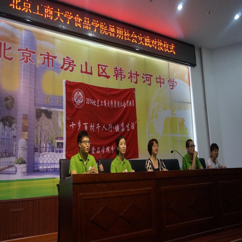7月5日,食品學(xué)院實(shí)踐團(tuán)45名同學(xué)乘車來到韓村河中學(xué)。經(jīng)過簡單休整,下午,暑期社會(huì)實(shí)踐食品學(xué)院實(shí)踐分團(tuán)與韓村河中學(xué)舉行了對(duì)接儀式。韓村河中學(xué)團(tuán)委書記王艷平老師、團(tuán)委陳楓琳老師、食品學(xué)院團(tuán)總支書記劉晶老師、輔導(dǎo)員夏賓老師及兩校學(xué)生參加儀式。