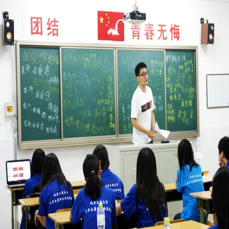 伴隨著夕陽落下,交流會(huì)也開始了,材機(jī)學(xué)院實(shí)踐團(tuán)成員們向同學(xué)們介紹大學(xué)生活方式。對(duì)每一位中學(xué)生而言大學(xué)生活都如同一幅神秘的畫卷,向往而期待。實(shí)踐團(tuán)的成員作為他們的小老師,將自己對(duì)大學(xué)生活的感悟與他們共同分享,使同學(xué)們對(duì)大學(xué)生活充滿向往,對(duì)人生規(guī)劃進(jìn)行一定的安排。小老師們在支教中,已對(duì)孩子們有了初步了解,并使一個(gè)班變?yōu)橐粋€(gè)大家庭,大家和樂融融地相處在一起。材機(jī)學(xué)院社會(huì)實(shí)踐團(tuán)的成員們一定能在接下來的四天里,以身作則,將自律、快樂、夢想與希望帶給孩子們,使他們擁有一個(gè)有意義的夏令營。