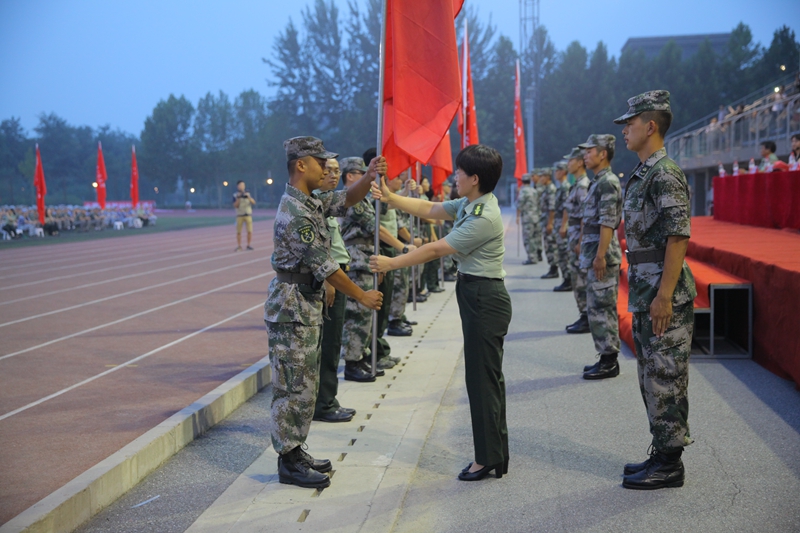 隨著莊嚴的國歌奏響,標志著為期14天的軍訓正式拉開帷幕。譚向勇書記向軍訓團莊重地授予了團旗。隨后,軍訓團團長李萌、政委呂素香將軍訓團營旗授予各營營長、教導員。六面營旗交相輝映,會場氣氛熱烈而高漲。