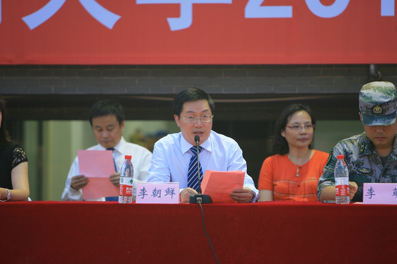 校黨委書記譚向勇、黨委副書記盧思鋒出席儀式。副校長李朝鮮主持開訓儀式。學校各學院領導、軍訓指揮部各成員單位領導、承訓部隊教官、學校軍訓團營、連負責人和2014級全體參訓學生及部分學生家長參加典禮。