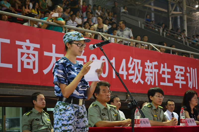 來自計算機與信息工程學院的龐琳作為軍訓學員代表發言,倡議大家在軍訓期間做到:在思想上高度重視,積極參與,全力投入;一切行動聽指揮,服從老師和教官的管理;嚴格訓練,不怕苦、不怕累,堅決完成訓練任務;嚴于律己,愛護集體榮譽,爭當優秀學員,爭創先進連隊。