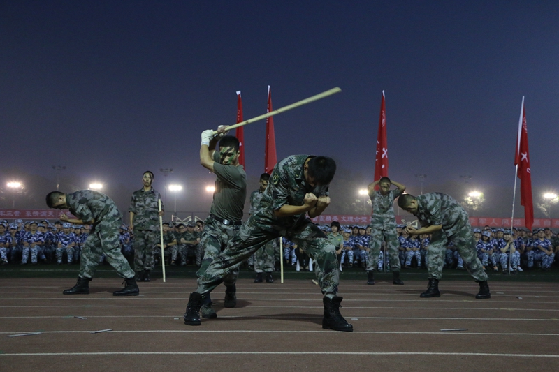 承訓部隊教官們為大家帶來了精彩的表演。4*6人的方陣跑入場內,一聲聲“殺”的口號喊出了刺殺操雄赳赳的氣勢;左手持盾牌、右手握警棍的教官的盾牌操,彰顯出他們颯爽的英姿;兩組表演過后,一名教官用頭部、肘部和腿部將重達1斤的鋼板斷裂成塊,博得在場觀眾的陣陣掌聲;10人小方陣為全場觀眾帶來了捕俘拳展示,并在表演結束后同時完成撞擊鋼板的動作,氣勢震懾全場;最后6名戰士用身體不同部位將直徑約5厘米的木棍斷成數截,在場觀眾無一不被他們吸引,贊美與敬佩溢于言表。