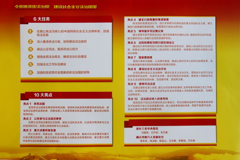 在我國首個(gè)國家憲法日(12月4日)之際,現(xiàn)選取題為《全面推進(jìn)依法治國 建設(shè)社會(huì)主義法治國家》的圖片專輯,從圖解十八屆四中全會(huì)公報(bào)、全面推進(jìn)依法治國的指導(dǎo)思想、全面推進(jìn)依法治國的總目標(biāo)、黨的領(lǐng)導(dǎo)是社會(huì)主義法治最根本保證、全面推進(jìn)依法治國的重大任務(wù)等五方面介紹十八屆四中全會(huì)精神,供全校師生學(xué)習(xí)。