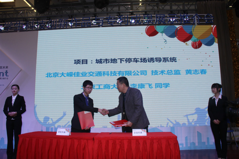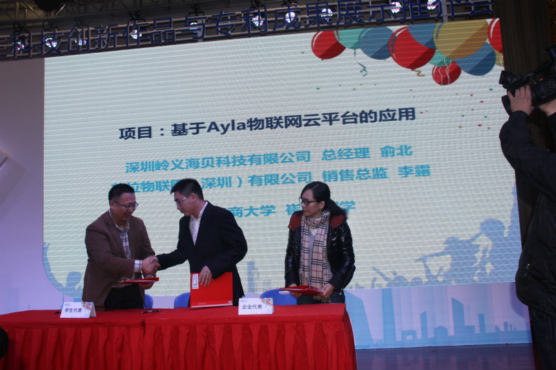 我校學生李康飛代表課題組和北京大嶸佳業交通科技有限公司就“城市地下停車場誘導系統”課題現場簽訂了合作意向書。我校學生代表崔健和深圳嶺以海貝科技有限公司、艾拉物聯網(深證)有限公司就“基于Ayla物聯網云平臺的應用”進行了現場簽約。這兩項作品憑借大膽創新、精確的結構設計及以人為本的設計理念,贏得了相關企業和專家的好評。