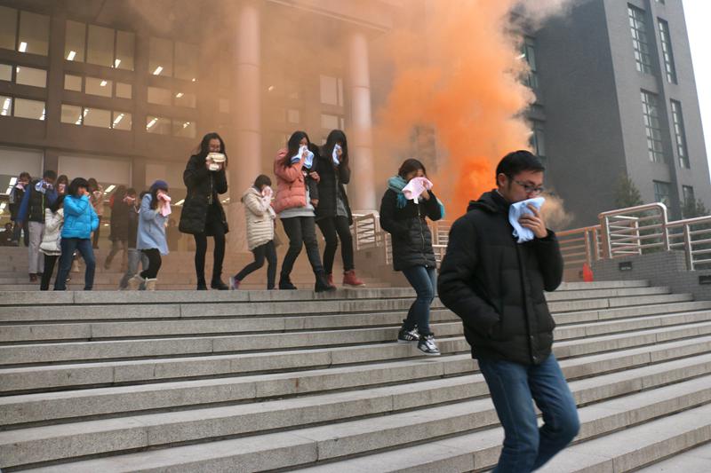 為進一步做好學(xué)校防火安全工作,增強師生員工消防安全意識,提高師生員工安全防范及自救能力,12月9日,學(xué)校在圖書館組織開展安全應(yīng)急疏散演習(xí)。300多名師生參加了演習(xí)活動。演習(xí)總指揮由黨委副書記盧思鋒擔(dān)任。圖書館、保衛(wèi)處、校辦、后勤管理處、學(xué)生處、宣傳部、國有資產(chǎn)管理處、規(guī)劃建設(shè)處、校醫(yī)院及各學(xué)院安全負責(zé)人協(xié)助組織、保障演習(xí)順利完成。 下午16:00,盧思鋒副書記宣布演習(xí)正式開始。圖書館西側(cè)煙霧滾滾模擬301閱覽室發(fā)生火災(zāi),圖書館辦公室同志向館長報告火情,館長指示滅火組立即滅火、向保衛(wèi)處通報并準備疏散。隨后,館內(nèi)警報響起、應(yīng)急廣播開啟。演習(xí)顯示閱覽室火勢蔓延,無法控制,學(xué)校應(yīng)急分隊到達圖書館。在館長“通知全體按預(yù)案撤離,通報保衛(wèi)處”的處置方案下,300余名學(xué)生在各閱覽室值班員、保安員的組織下以毛巾掩面,有序從圖書館撤離,在圖書館西側(cè)集合,進行人數(shù)清點。在人員撤離和應(yīng)急分隊繼續(xù)滅火的同時,現(xiàn)場還演練了救護組救護因傷被困人員、警戒組協(xié)助消防隊保護現(xiàn)場、校醫(yī)院醫(yī)生在救護所內(nèi)對傷者進行救治等。演習(xí)模擬逼真,人員撤離有序。 全部疏散完畢后,保衛(wèi)處和圖書館對現(xiàn)場人員疏散情況進行報告、國有資產(chǎn)管理處到達現(xiàn)場清查火災(zāi)損失,同時,保衛(wèi)處協(xié)助公安消防部門保護現(xiàn)場,清查火災(zāi)原因。 演習(xí)結(jié)束后,盧思鋒副書記發(fā)表講話,強調(diào)了安全應(yīng)急疏散演習(xí)的意義,并對參與師生的合作表示感謝。隨后,盧思鋒主持召開會議對本次演習(xí)進行總結(jié),與會同志對演習(xí)的效果、場景的設(shè)置、各環(huán)節(jié)在演習(xí)中的呈現(xiàn)等發(fā)表了看法,并對開展好下一次演習(xí)提出了建議。