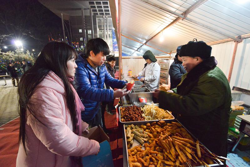 文體館前的小吃街則是師生們每年“牽腸掛肚”的項目之一,在歡笑過后享受不同美食是一種幸福。為了此次小吃街的順利開業(yè),學校餐飲部門的工作人員很早便開始了各項準備工作。賣羊肉串的大叔介紹,“我們提前一個星期就將所有東西準備好了,每天都加班在做著準備。”晚會落下帷幕,小吃街也漸漸地熱鬧了起來,盡管當天降溫,室外溫度只有零下幾度,但這絲毫低擋不住美食的誘惑,每個攤子前都站滿了同學,手拿著各式小吃,形成了一道獨特的風景線。