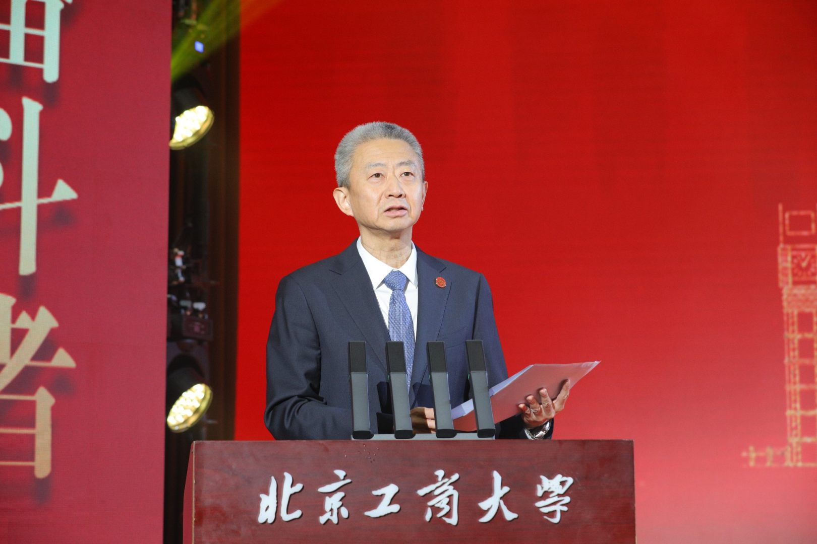 黨委書記沈千帆講話。他代表學校黨委向所有獲獎個人與集體表示最衷心的祝賀,向辛勤耕耘在育人一線的全體教職工致以最誠摯的敬意。沈千帆表示,七十五年來,學校始終與民族命運同頻共振、與國家發展同向同行,作為學校發展的見證者和推動者,過去一年,2300余名北工商學子榮獲校級及以上榮譽稱號,7600余人次斬獲各類獎學金,68個先進班集體脫穎而出,校長獎學金獲得者中半數以上已保送頂尖高校深造,多個團隊在“挑戰杯”“互聯網+”等賽事中屢創佳績,充分展現了同學們過硬的本領和昂揚向上的精神風貌。他為同學們提出三點希望:一是賡續紅色血脈,在“愛國奉獻”中錨定精神坐標。厚植家國情懷,把愛國情懷轉化為奮進力量。二是鍛造堅毅品格,在“敢闖敢拼”中筑牢成長根基。將先輩們不畏艱險、勇毅前行的精神基因融入血脈,用堅毅品格托舉青春夢想。三是堅持知行合一,在“善作善成”中書寫青春答卷。深耕專業沃土,讓創新成果綻放在中國式現代化的壯闊征程中。希望同學們堅定不移聽黨話、跟黨走,努力成長為有理想、敢擔當、能吃苦、肯奮斗的復合型創新人才,在強國建設、民族復興偉業中勇擔重任、展現風采、貢獻力量,書寫為中國式現代化挺膺擔當的青春篇章。