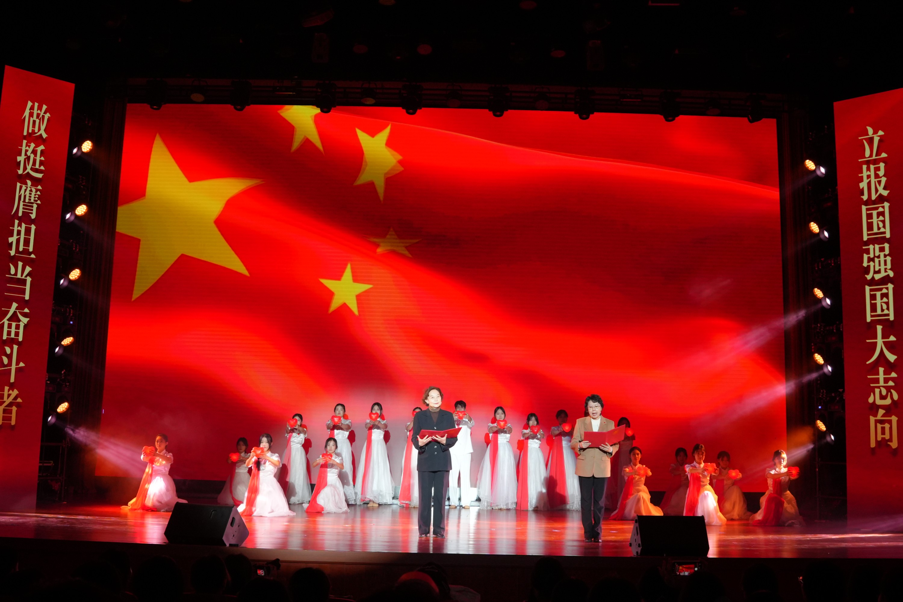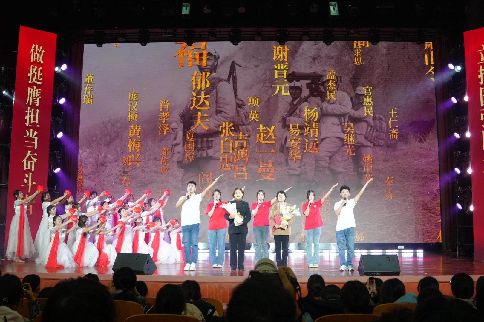 隨著歌舞節目《銘記》激情上演,“青春力量篇”拉開帷幕,該節目以紀念抗戰勝利80周年獻禮歌曲《銘記》為核心,以歌舞為主要表現形式,“一二·九”運動參與者后代陸瑩女士、黃玫女士為青年學子解讀“一二·九”精神,激勵青年學子勇擔時代重任,接力走好“新長征”的奮進之路。