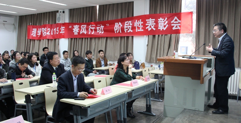 4月8日,為總結(jié)“春風(fēng)行動(dòng)”經(jīng)驗(yàn)、典型做法,對(duì)活動(dòng)階段性成果進(jìn)行表彰,學(xué)院召開(kāi)2015年“春風(fēng)行動(dòng)”學(xué)風(fēng)建設(shè)階段性表彰會(huì)。院長(zhǎng)曹顯兵、黨總支書(shū)記祝鈞、副院長(zhǎng)李寶河及輔導(dǎo)員、班主任代表出席會(huì)議,黨總支副書(shū)記王嘉彥主持會(huì)議。