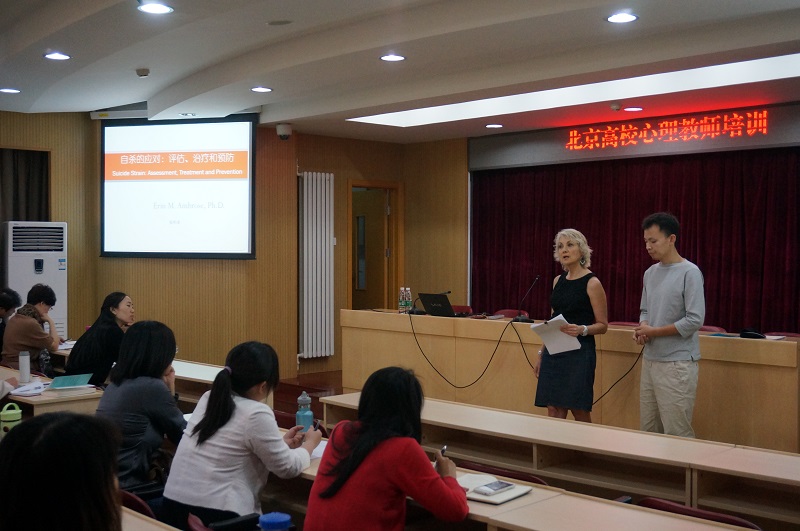 本次培訓的主題是大學生自殺心理危機的理論研究及干預技術,由來自美國的艾琳安布魯斯博士主講。在三天的講座過程中,安布魯斯博士系統(tǒng)介紹了關于自殺的“張力”理論,并結(jié)合從2009年至今長達6年的關于北京高校大學生的研究數(shù)據(jù),給出了關于識別大學生自殺意圖的方法建議。培訓中進行了互動性團體輔導治療方法展示,從技術上介紹了如何積極關注學生,建立關系鏈接以及給予來訪者正向支持。