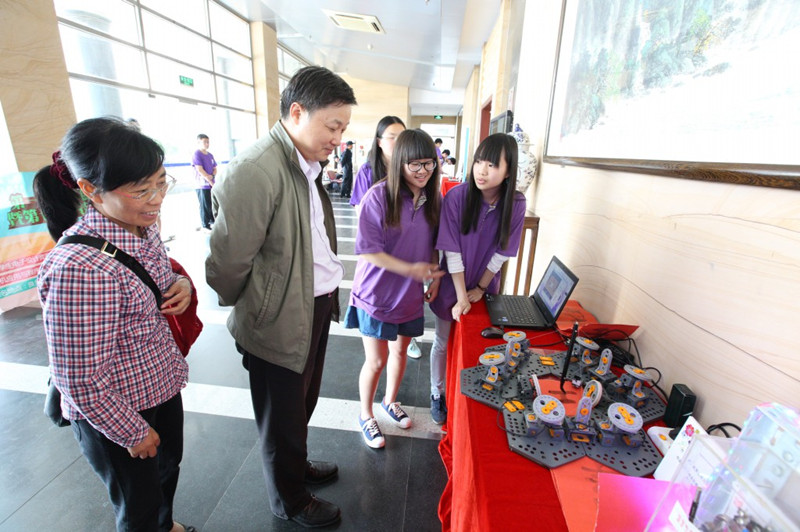 在展出的學生科技作品中,書法機器人、智能巡跡小車、智能熱水器、超市手機購物APP、電子密碼鎖等一件件實用而有創意的學生作品吸引了大家的目光,師生不時駐足觀看,有的還饒有興趣的進行了動手操作。