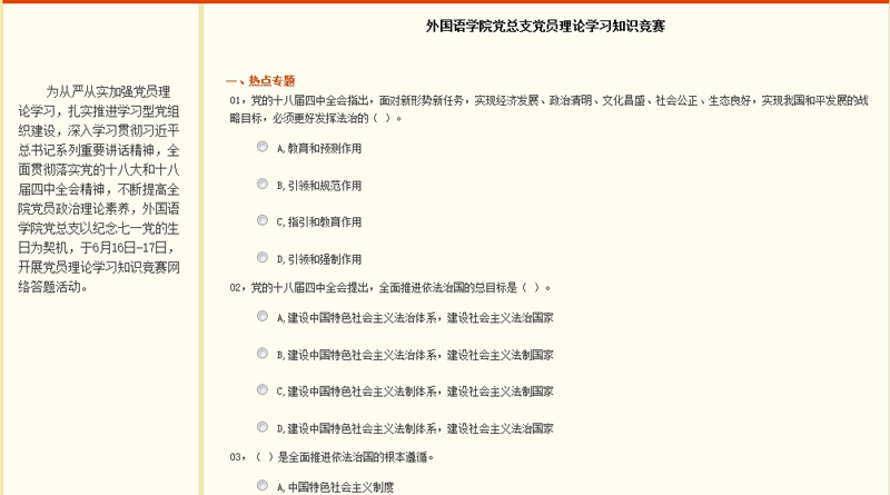 為從嚴(yán)從實(shí)加強(qiáng)黨員理論學(xué)習(xí),扎實(shí)推進(jìn)“三嚴(yán)三實(shí)”專題教育,建設(shè)學(xué)習(xí)型黨組織,外國(guó)語(yǔ)學(xué)院黨總支實(shí)現(xiàn)“互聯(lián)網(wǎng)+” 理論學(xué)習(xí)創(chuàng)新,近期開(kāi)展黨員理論學(xué)習(xí)網(wǎng)絡(luò)知識(shí)競(jìng)賽活動(dòng),各個(gè)黨支部廣泛參與,“以賽促學(xué)”,開(kāi)展理論學(xué)習(xí)及專題研討,以實(shí)際行動(dòng)紀(jì)念“七一”黨的生日。