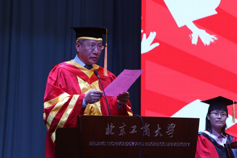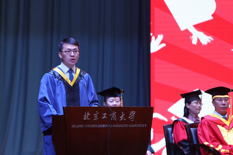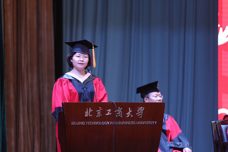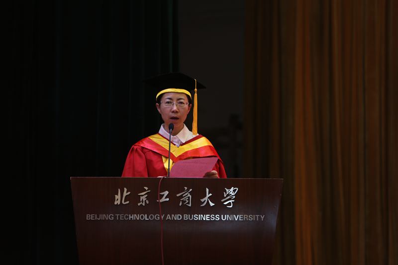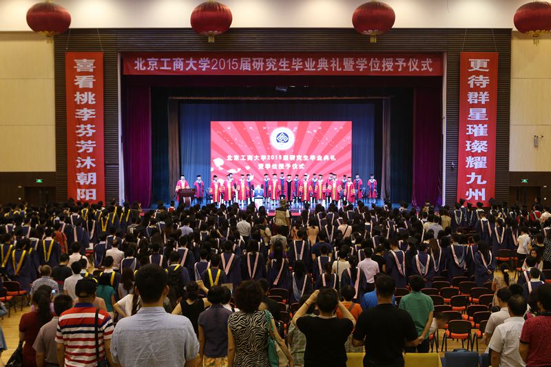 伴隨著雄壯的國歌聲,2015屆研究生畢業典禮拉開了序幕。謝志華副校長宣讀了《北京工商大學關于2015屆研究生準予畢業及授予學位的決定》。2015年,我校共有824名研究生完成全部課程,學??傆嬍谟?span lang="EN-US">855名研究生碩士學位。隨后,黨委副書記董竹娟宣讀了《北京工商大學關于表彰2015屆研究生優秀畢業生的決定》,共有68名優秀研究生被評為校級優秀畢業生,其中29人被推薦為市級優秀畢業生。