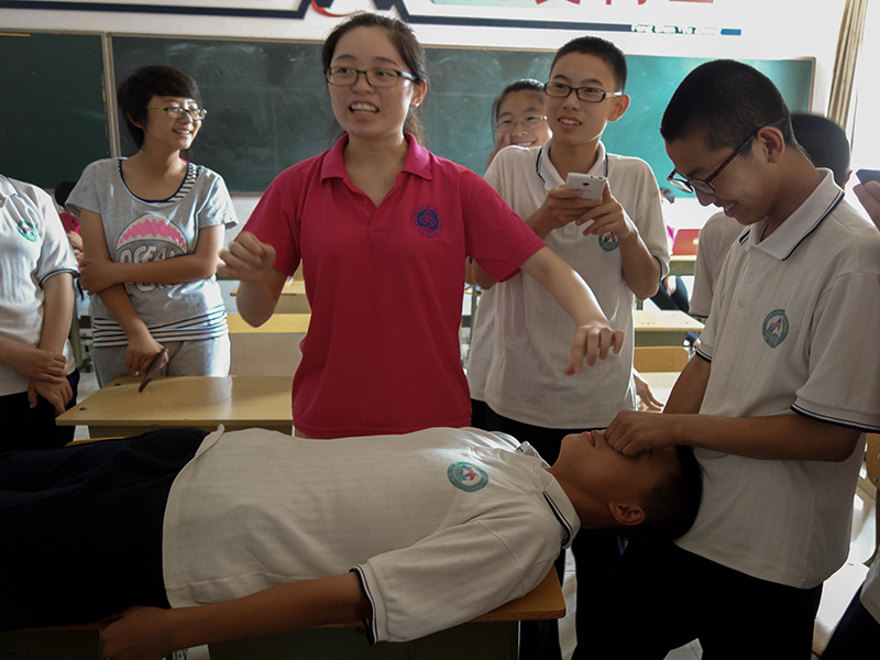 急救的課堂同樣富有吸引力。小老師教給初中生們日常生活中遇到的一些例如魚刺卡喉,流鼻血以及曬傷等情況的急救小貼士,初中生們對于這些與生活息息相關的知識特別感興趣,紛紛應和著老師,和小老師說著自己的經歷。緊接著,小老師又和大家討論了當遭遇地震、火災等自然災害時的逃生以及自救方法。當說到急救時,小老師與同學合作向大家展示心肺復蘇的方法,班級里氣氛活躍起來。英語課上,小教師帶大家游覽了動物園并讓初中生們分組用英語進行場景模擬,在展示環節中,教室里的氣氛十分活躍,同學們都積極的想展示自己組的討論成果。小老師用英語向初中生們介紹了動物園的各種動物以及他們的特征,豐富了同學們的詞匯。合唱課上,小老師教給大家合唱的要素、如何發聲以及需要注意的問題,大家按照小老師的要求認真練習,課堂中時不時傳來笑聲。
