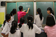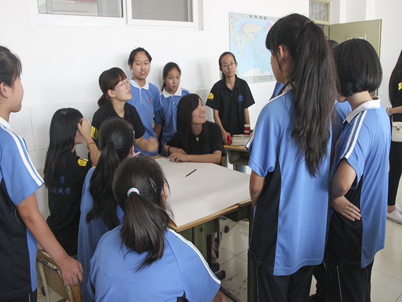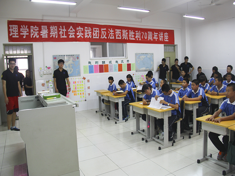 今年是“中國人民抗日戰(zhàn)爭暨世界人民法法西斯戰(zhàn)爭勝利70周年”,為此,實踐團的小老師為同學們準備了黨史教育課。從九一八事變到七七事變再到南京大屠殺,從平型關大捷到臺兒莊戰(zhàn)役再到百團大戰(zhàn)。整堂課采取分組搶答,累計積分的形式。同學們爭先恐后地回答老師提出的有關抗日戰(zhàn)爭的問題,課堂氣氛活躍。工藝美術課上,同學們在老師的指導下,以“紀念抗日戰(zhàn)爭勝利70周年”和“中國夢”為主題為班級設計板報,同學們拿著五彩的畫筆描繪著抗戰(zhàn)過程中的英雄事跡和自己心中的中國夢,以這樣的方式銘記歷史,展望未來。接下來的舞蹈賞析課,老師為同學們介紹了舞蹈的分類,即傳統(tǒng)表演舞蹈、流行表演舞蹈、傳統(tǒng)實用舞蹈和流行實用舞蹈。