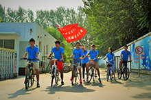 藝傳學院暑期實踐團來到南召中學的第三天上午十點,氣溫逼近三十八度。于兩個小時前集合騎車出發(fā)的實踐團調研組六名組員以及宣傳組兩名成員仍然分頭穿梭在西南召村,身著藍色隊服的他們成了街頭巷尾的一道清涼的風景線。