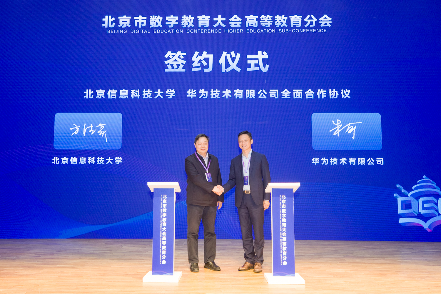成果發(fā)布環(huán)節(jié),北京林業(yè)大學(xué)和中國(guó)電信股份有限公司北京分公司,北京信息科技大學(xué)和華為技術(shù)有限公司,北京工商大學(xué)和北京網(wǎng)梯科技發(fā)展有限公司分別進(jìn)行了簽約儀式。在數(shù)智教育新時(shí)代,加強(qiáng)校企合作,有利于雙方立足各自領(lǐng)域,本著產(chǎn)學(xué)研相結(jié)合、資源共享、共同發(fā)展、互相促進(jìn)的原則,從戰(zhàn)略發(fā)展的角度,協(xié)同推進(jìn)高等教育數(shù)智化發(fā)展不斷攀登新高。