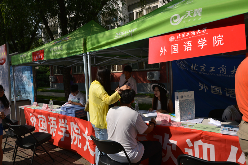 一大早,各部門、各學院的負責人、老師及學生志愿者們便來到現場,為迎接新生們做好充足準備。理學院將化妝品專業學生自制的化妝品供新生試用;食品學院懸掛的標語“Young在工商 Hold住夢想”別樣新穎;計信學院將報到流程圖文并茂地印刷在展板上方便新生快速辦理;材料學院的班主任們全勤到崗,耐心細致地向新生和家長介紹專業特色和專業方向;經濟學院高年級的學生最早到達招新現場開始布置;身著商學院院服的志愿者遍布良鄉校區生活區東門到迎新點的每一個岔路口,將商院紅燃到了商學院每一個新生的心中;法學院迎新處張貼了學生手繪的“良鄉校區導航圖”,并提前對迎新人員進行了三次培訓以便提供更加優質的服務;外國語學院則以“歡迎、完美、溫暖”為主線開展迎新活動;藝傳學院總計安排近30位老師參與迎新,并印制入學前兩天的時間安排表,讓學生更清晰地了解學院安排。