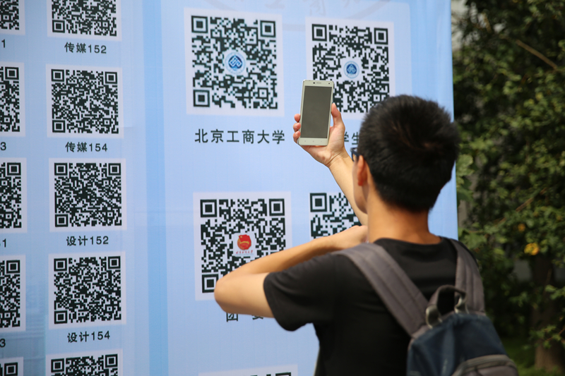 “掃一掃碼,歡迎到家”,一進入良鄉校門,一面印有8個學校職能部門、9個學院83個新生班級二維碼的展板映入眼簾,引起學生家長和新生駐足。在阜成路校區的學校門口和各學院報到處也設立有學校、研工部及研究生各學院微信二維碼展板,新媒體的注入成為本屆迎新的一大亮點。許多新生在現場拿出手機,通過掃描二維碼,可以加入新生群和學校各職能部門的公眾號,快速便捷地融入到北工商的校園氛圍中。