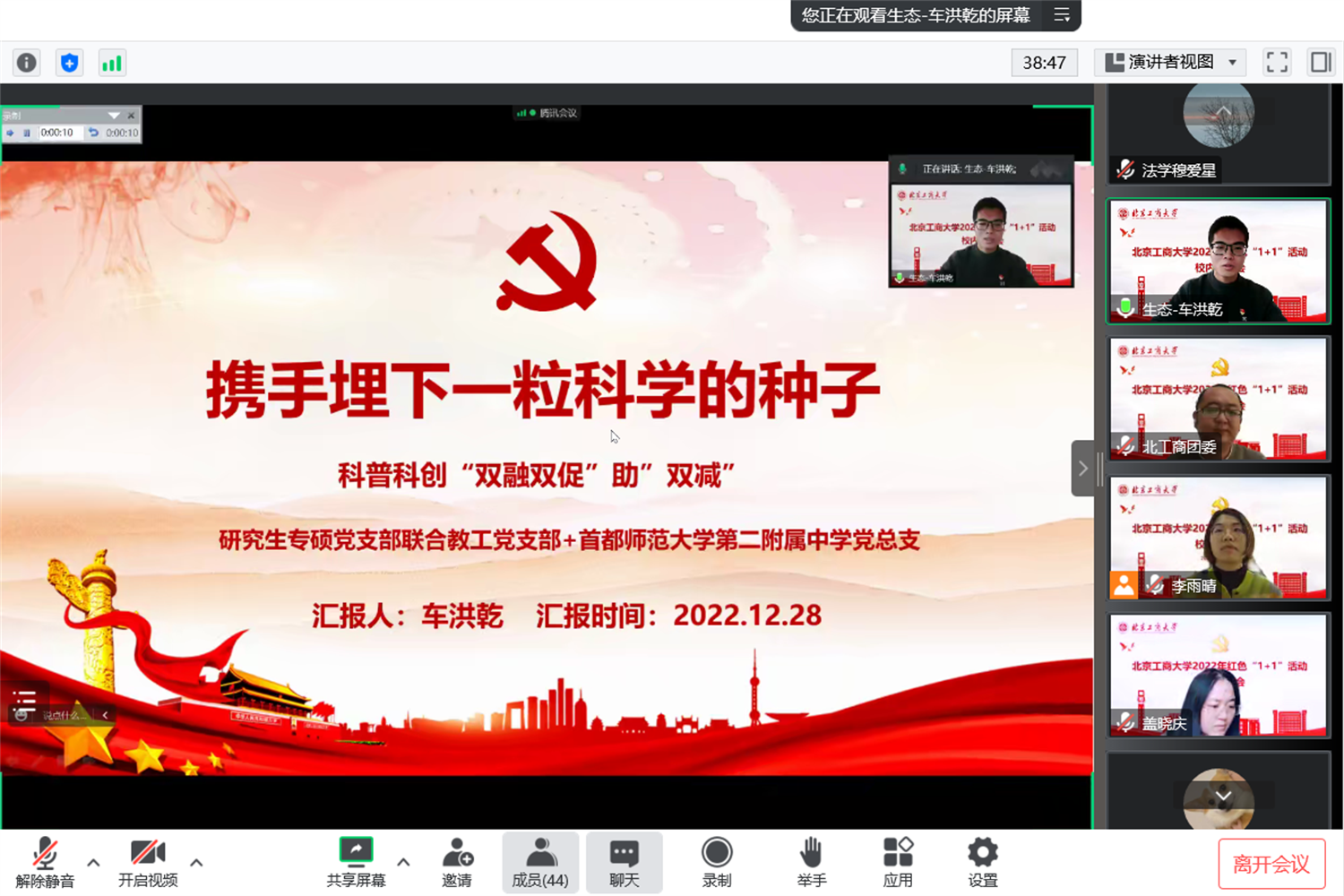 生態環境學院和傳媒與設計學院的黨支部分別與首都師范大學第二附屬中學及中國宋慶齡科技文化交流中心的黨支部進行共建,結合學院所長為青少年開設科創項目,有效助力青少年的全面發展;經濟學院、商學院、國際經管學院的黨支部延續各自的傳統共建項目,在現有成果的基礎上,繼續深挖資源、開拓創新、結合專業優勢為鄉村振興注入新的智慧元素;數學與統計學院和輕工科學技術學院的黨支部與周邊社區開展共建,通過理論宣講、防疫志愿、普法宣傳等活動,將黨的二十大精神學習落到實處。答辯環節,各位評委針對共建內容進行提問,各支部代表沉著冷靜、思路清晰、有理有據的回答進一步詮釋了共建活動的思路和成效。