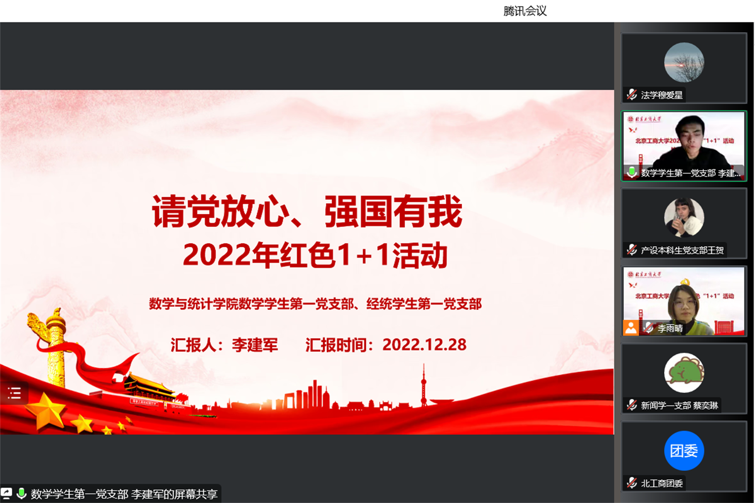 今年的紅色“1+1”活動以“請黨放心 強國有我”為主題,緊密圍繞學習宣傳貫徹黨的二十大精神這一中心內容展開。我校共有15個黨支部完成共建任務,經申報,12個支部進入最終的評審環節。評審會上,各學生黨支部通過5分鐘展示再現了本支部與共建單位開展的各項活動。