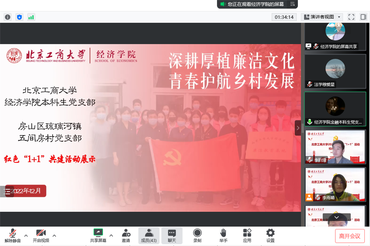 12月28日,學校舉行2022年紅色“1+1”活動校內評審會。本次評審會通過線上方式舉辦,來自各學院的12個黨支部參加展示和答辯,黨委組織部、學生工作部、研究生工作部、團委負責人及各學院教師代表擔任評委。