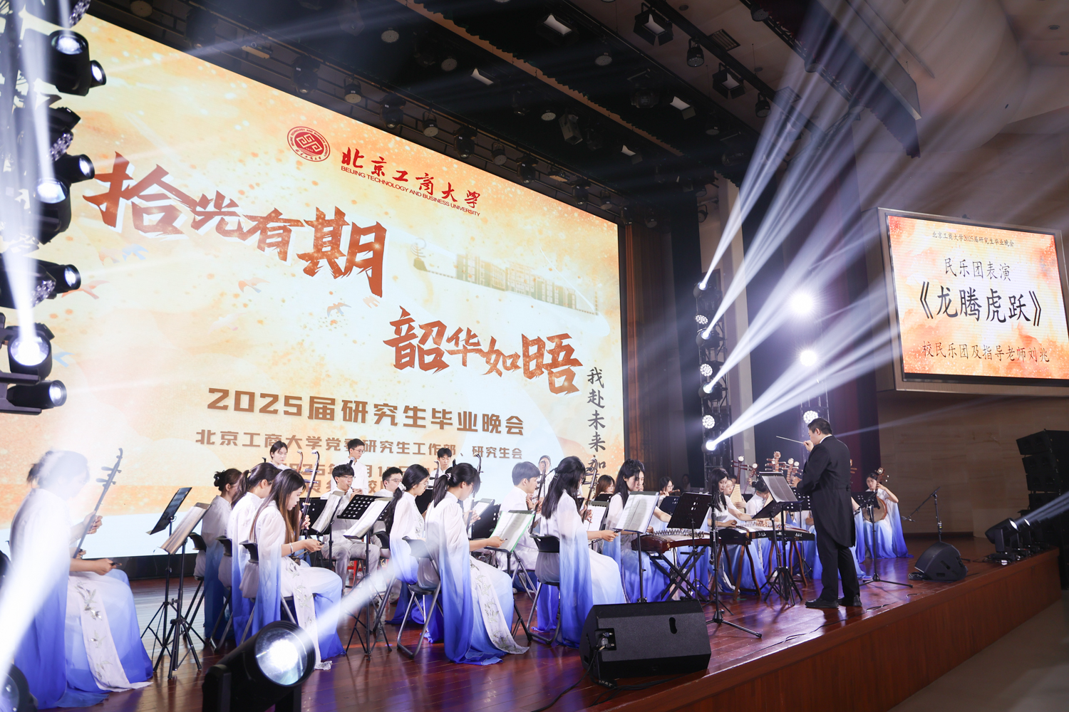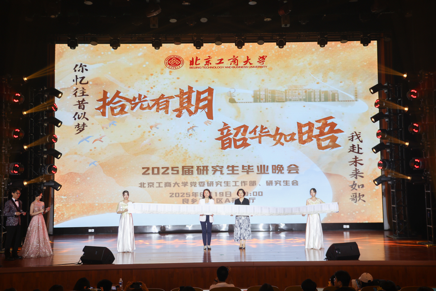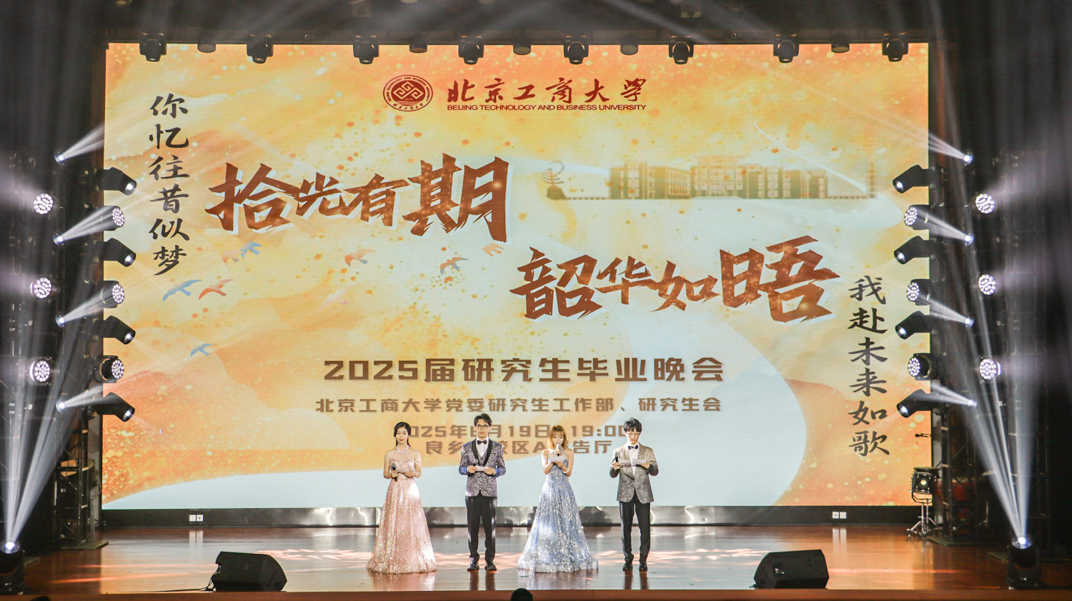 6月19日晚,學校在良鄉校區舉行“拾光有期·韶華如晤”2025屆研究生畢業晚會。學校黨委副書記李中奇、校友會辦公室主任張春萍、黨委研究生工作部部長郭新愿、馬克思主義學院黨總支書記任金晶、黨委研究生工作部副部長兼研究生院副院長張倩、研究生院副院長申現寶、保衛處副處長盧燦寬、公共事務處副處長馬騰、商學院黨委副書記張悅、數學與統計學院黨委副書記畢平平、校民樂團指導教師劉兆以及各學院輔導員、研究生代表等600余人共同觀看晚會。