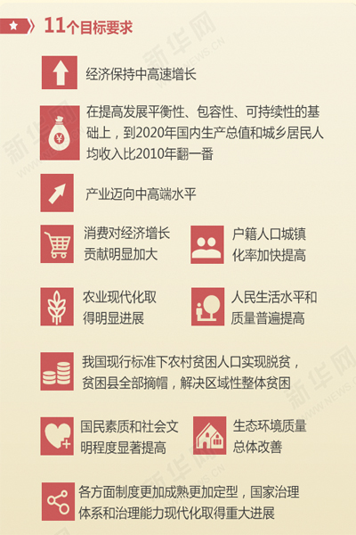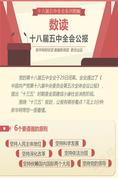 黨的第十八屆五中全會于10月29日勝利閉幕。全會聽取和討論了習近平總書記受中央政治局委托作的工作報告,審議通過了《中共中央關于制定國民經濟和社會發展第十三個五年規劃的建議》。全會通過的《中國共產黨第十八屆中央委員會第五次全體會議公報》,描繪了未來五年的發展藍圖。“十三五”時期是全面建成小康社會決勝階段,新華網10月29日發表文章,對《會議公報》進行解讀,現將文章轉載如下: