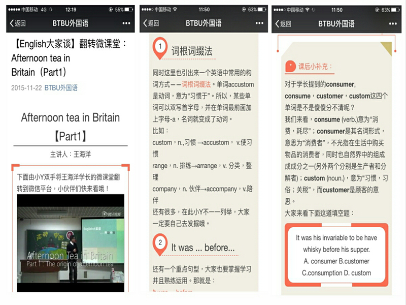 另外,學院以專業(yè)教師、外籍教師為指導教師,對精“英”小導師進行精心指導,進行微課專業(yè)設計。同時,組成“翻轉(zhuǎn)微課堂”團隊,對微課進行實時錄像,制作“翻轉(zhuǎn)微課堂”教學視頻,總結(jié)課堂知識要點,拓展語言文化內(nèi)容,定期發(fā)布學院官方微信,保證線上線下不斷線,溫故知新,形成閉環(huán)學習效果。