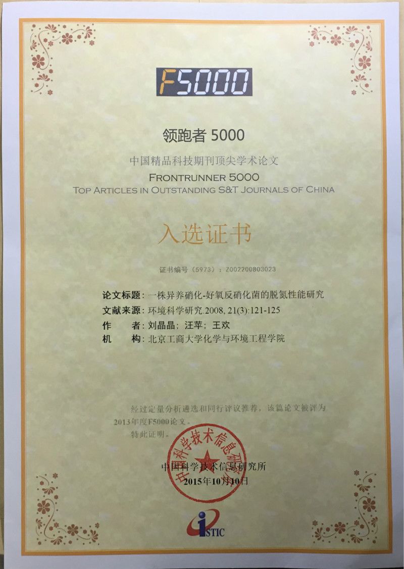 近日,我校食品學(xué)院汪蘋教授2008年發(fā)表的論文《一株異養(yǎng)硝化-好氧反硝化菌的脫氮性能研究》入選“領(lǐng)跑者5000——中國精品科技期刊頂尖論文(簡稱F5000)”,這是我校教師論文首次入選該平臺(tái)。