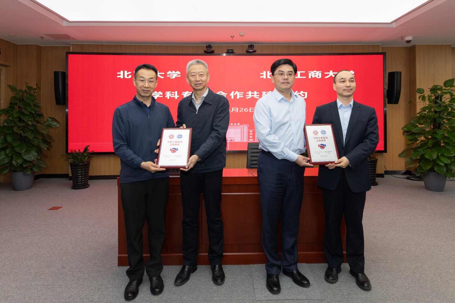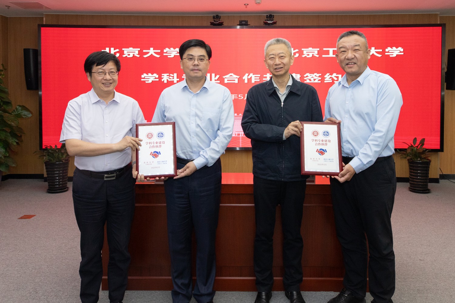 北京大學計算機學院院長胡振江和我校計算機與人工智能學院執行院長李海生簽約;沈千帆和方方為雙方頒發簽約紀念牌。