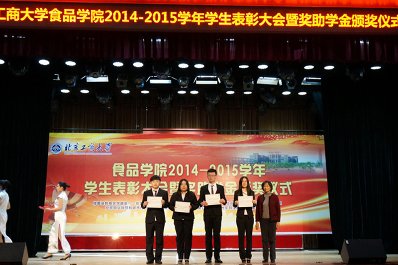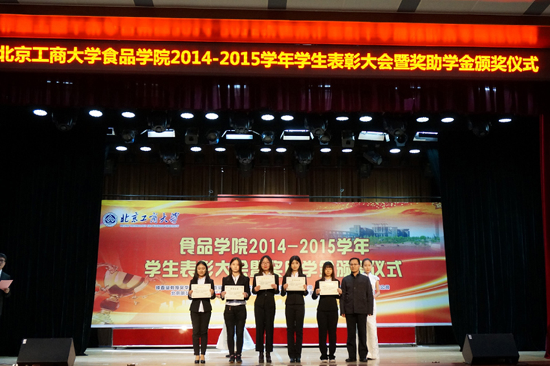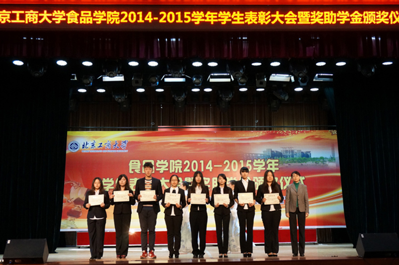 加強學風建設,表彰優秀,樹立榜樣,1216日,食品學院在阜成路校區舉行2014-2015學年學生表彰大會暨獎助學金頒獎儀式,會上表彰了16項獲得學院先進的集體和個人,頒發了學校及學院共7項獎助學金。學校黨委副書記董竹娟,鐘捷女士,北京居然之家投資控股集團有限公司董事長兼總裁汪林朋,中國日化院黨委副書記、紀委書記耿濤,北京味食源食品科技有限責任公司董事長田崇華,北京明宏科貿有限責任公司植物醫生產品部總監,研發中心總經理王雅琴中國光華科技基金會光華大學生發展基金執行理事長兼秘書長邊振岳,學校相關職能部門負責人以及學院領導、系主任、班主任、輔導員參加表彰會。