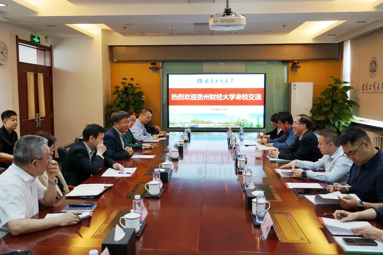 戰勇對我校的熱情接待表示感謝,介紹了學校的基本情況和伴隨“貴州黃金十年”所取得的跨越式發展。北京工商大學辦學歷史悠久,辦學特色鮮明,地域優勢突出,發展勢頭強勁,貴州財經大學是一所以經濟學、管理學為主體的多科性高等學府,與北京工商大學淵源深厚,在新時代背景下具有良好的合作基礎和廣泛的合作前景。為進一步提升辦學水平,更好地服務貴州區域經濟發展,希望借助北京工商大學的科研優勢,在學科建設、科學研究和人才培養等方面得到更多指導和支持,開展更務實、更廣泛、更深入的合作,實現資源共享、優勢互補、共建共贏。推動雙方關系邁向新階段。