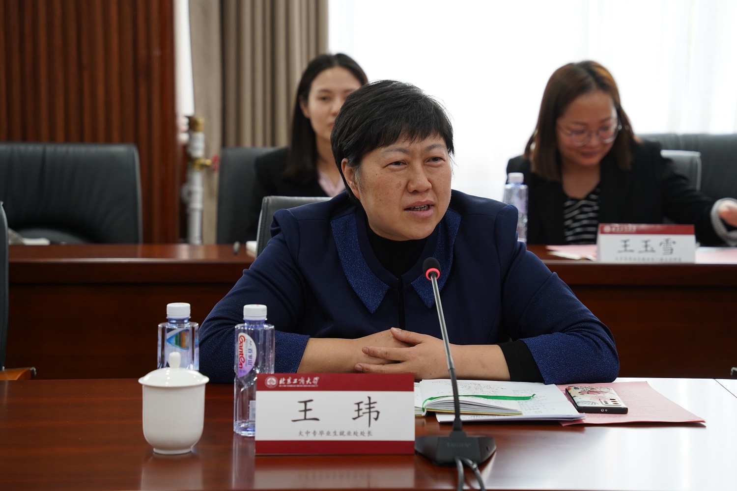 楊林介紹了學(xué)校畢業(yè)生就業(yè)情況,并對(duì)各區(qū)生源情況進(jìn)行詳細(xì)分析。各區(qū)人社局負(fù)責(zé)人分別介紹了本區(qū)就業(yè)工作推動(dòng)和開展情況,并對(duì)有關(guān)就業(yè)政策進(jìn)行了解答,希望與學(xué)校各學(xué)院加強(qiáng)合作聯(lián)系,千方百計(jì)為畢業(yè)生解決就業(yè)難題。石松與各學(xué)院相關(guān)就業(yè)負(fù)責(zé)人就大學(xué)生就業(yè)現(xiàn)狀及面臨的就業(yè)難點(diǎn)等問(wèn)題與人社局相關(guān)部門負(fù)責(zé)人進(jìn)行了充分交流和溝通。王瑋對(duì)學(xué)校“立足北京、服務(wù)首都”為北京市培養(yǎng)和輸送高質(zhì)量人才表示了肯定,她表示要進(jìn)一步加強(qiáng)各區(qū)支撐產(chǎn)業(yè)與學(xué)校特色專業(yè)的精準(zhǔn)對(duì)接,持續(xù)推進(jìn)資源匯聚,精準(zhǔn)對(duì)接畢業(yè)生需求,提升服務(wù)效能。