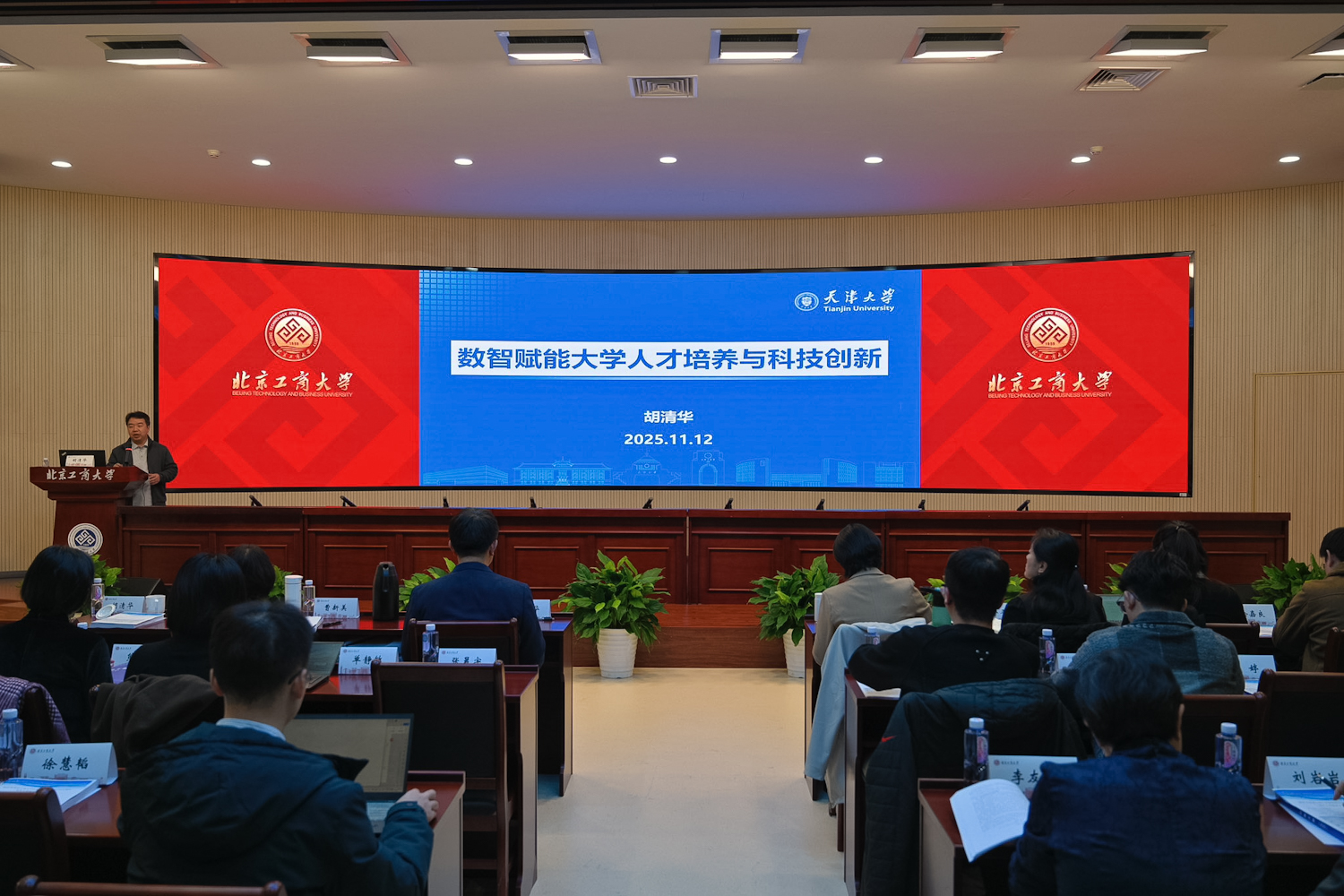會上,郭建華向新晉研究生導(dǎo)師表示祝賀,并指出導(dǎo)師作為“研究生培養(yǎng)第一責(zé)任人”,肩負著培育培養(yǎng)高層次創(chuàng)新人才的重要使命,要恪守師道、以身垂范,落實好立德樹人根本任務(wù)。他闡釋了“工商一體化”發(fā)展理念,表示北京工商大學(xué)的“工商”不是一個詞,而是兩個獨立的字,承載著北京輕工業(yè)學(xué)院和北京商學(xué)院的基因印記與歷史榮耀。“工”與“商”不能孤立存在和發(fā)展,要以“技術(shù)賦能商業(yè)創(chuàng)新、商業(yè)驅(qū)動技術(shù)進步、數(shù)智助力供需適配”打破學(xué)科壁壘、深度融通,這是基于歷史積淀、又順應(yīng)時代要求的學(xué)校特色發(fā)展之路。他圍繞導(dǎo)師履職提出四點要求:一是以德立身。要將思想政治教育擺在首位,以言傳身教引導(dǎo)學(xué)生扣好學(xué)術(shù)生涯“第一粒扣子”,要將學(xué)術(shù)規(guī)范教育貫穿研究生培養(yǎng)始終,引導(dǎo)學(xué)生樹立正確的學(xué)術(shù)觀。二是以學(xué)立業(yè)。緊跟人工智能發(fā)展趨勢,主動學(xué)習(xí)新技術(shù)以打破傳統(tǒng)教學(xué)局限,培養(yǎng)學(xué)生自主學(xué)習(xí)與創(chuàng)新能力。三是以愛育人,踐行“供需適配”理念,結(jié)合學(xué)生個性特點、職業(yè)志向及社會需求與自身專長,制定個性化培養(yǎng)方案,避免照搬固有模式。四是以創(chuàng)爭先。要堅持以“工商一體化”發(fā)展理念為引領(lǐng),擁抱數(shù)字化變革,將AI融入教育科研,積極參與跨學(xué)科合作,依托學(xué)校發(fā)展戰(zhàn)略在細分領(lǐng)域打造特色優(yōu)勢。郭建華勉勵新晉導(dǎo)師要在提升自身科研能力的同時帶領(lǐng)學(xué)生站穩(wěn)學(xué)術(shù)立場、提升專業(yè)素養(yǎng),于育人與科研雙重實踐中把握機遇、實現(xiàn)價值,為學(xué)校研究生教育高質(zhì)量發(fā)展與國家高層次人才培養(yǎng)貢獻力量。