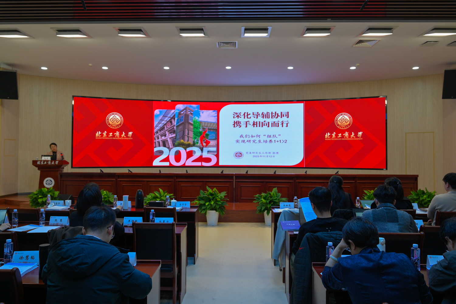政策解讀階段,黨委研究生工作部副部長、研究生院副院長張倩以《深化導(dǎo)輔協(xié)同,攜手相向同行——我們?nèi)绾巍敖M隊”實現(xiàn)研究生培養(yǎng)1+1>2》為題進行匯報交流,她提出明確研究生導(dǎo)師與輔導(dǎo)員的“育人合伙人”定位,校院兩級應(yīng)通過建立常態(tài)化溝通機制、明確協(xié)作分工、共創(chuàng)育人場域等路徑攜手同行,共同為研究生成長成才減壓、賦能、增效,切實以“工商一體化”發(fā)展理念引領(lǐng)研究生高質(zhì)量人才培養(yǎng),助力高水平研究型大學(xué)建設(shè)。研究生院副院長申現(xiàn)寶介紹了學(xué)校研究生培養(yǎng)、導(dǎo)師管理和學(xué)位制度體系,幫助新晉導(dǎo)師快速熟悉工作規(guī)范,明確底線要求。
