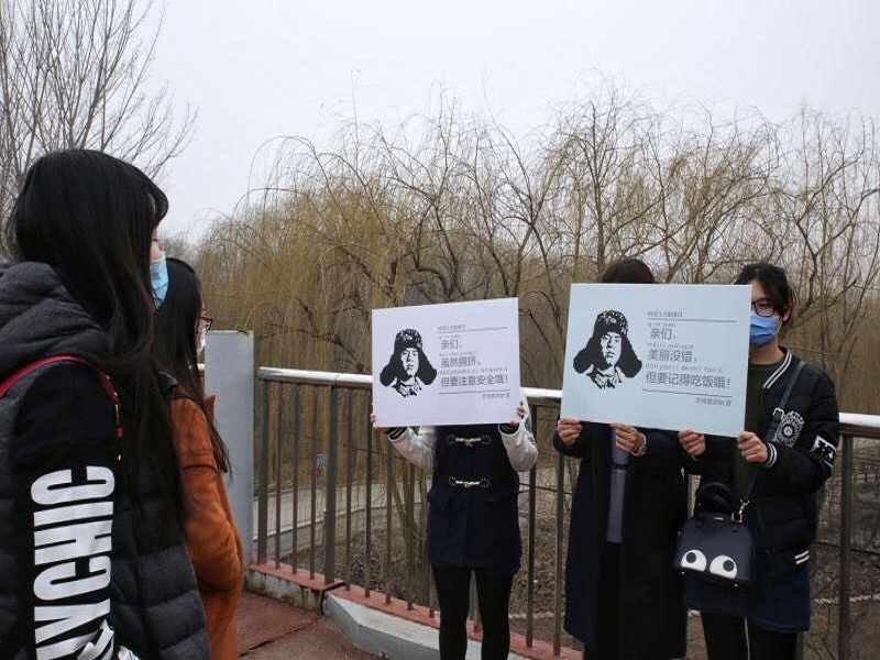 藝術與傳媒學院青志協的志愿者在生活區食堂門口、教學區以及南北兩側天橋上。舉起標語,提醒同學們注意身體,照顧好自己。