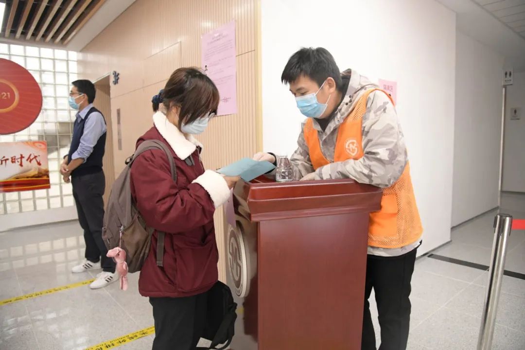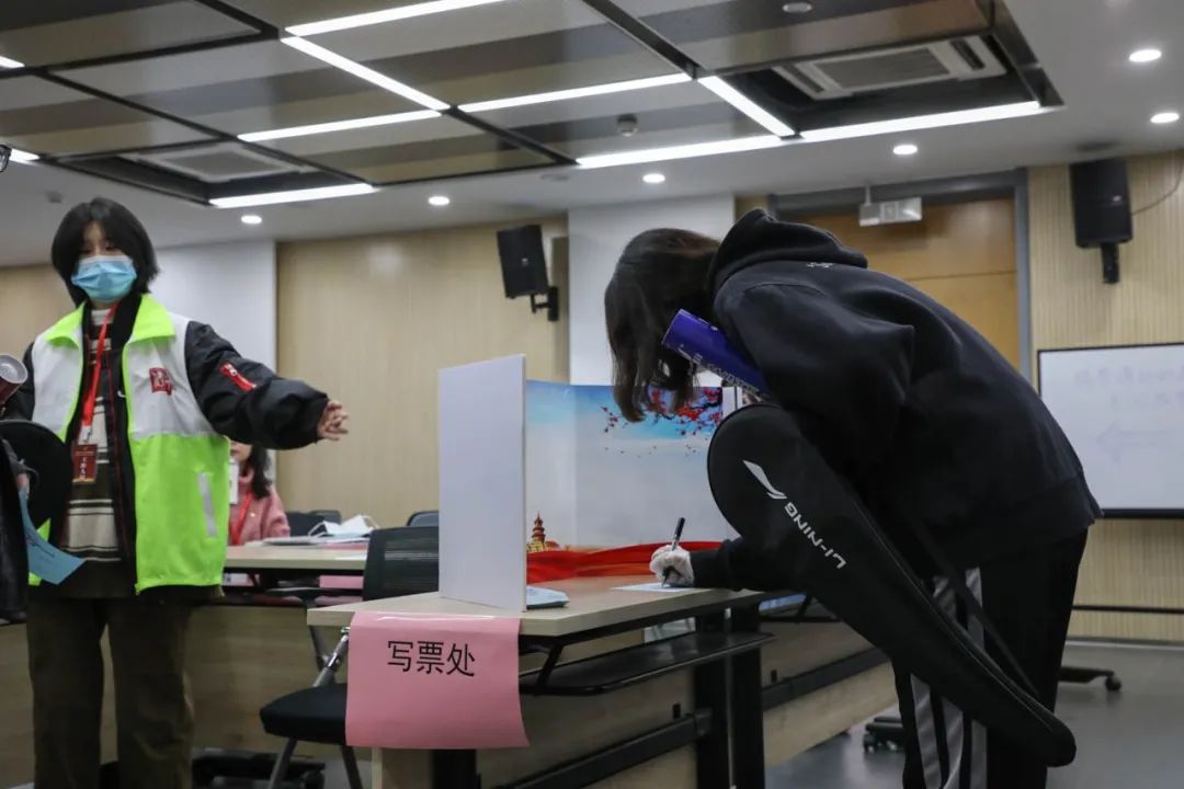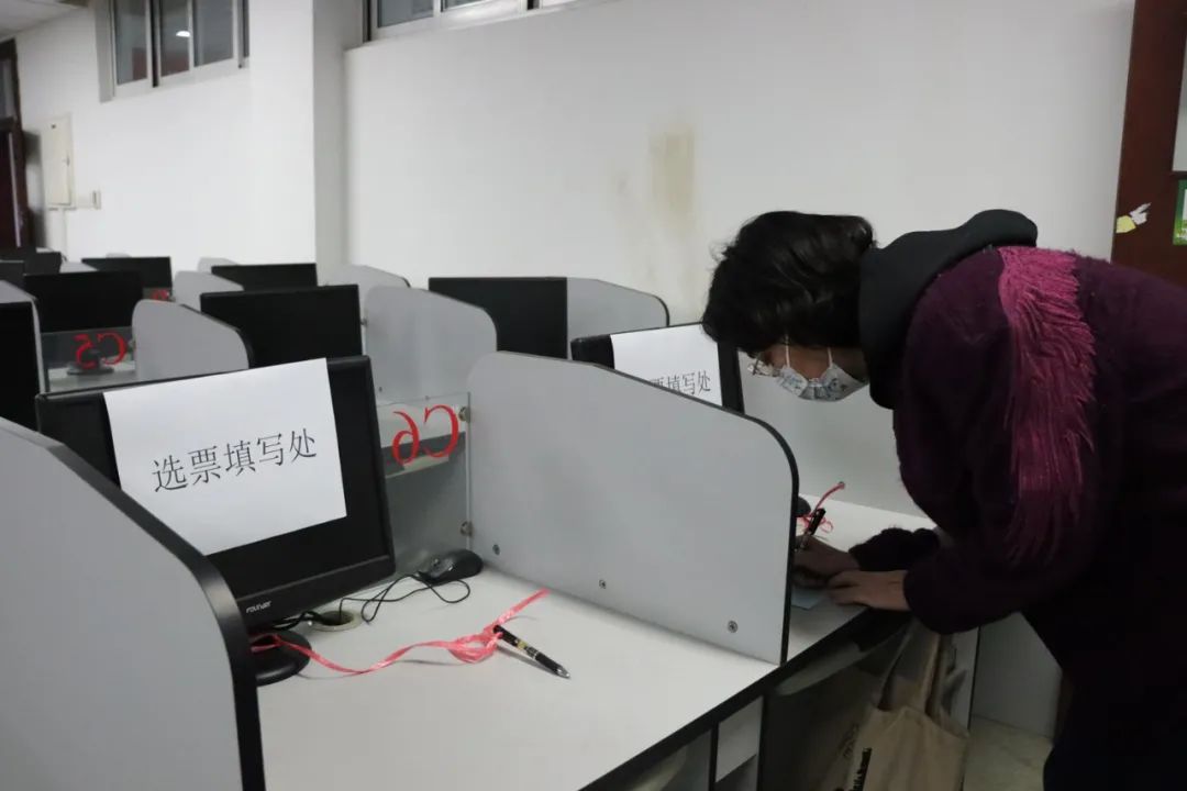 各投票站入口處嚴格執行測溫、佩戴口罩、手套等防疫要求,等待投票的選民在工作人員的引導下,規范入場、保持距離,在驗證發票處核驗身份后完成登記、發票、寫票、投票等環節。解說處工作人員耐心地向選民詳細解說寫票的方法與注意事項,代書處為有書寫困難的選民提供代寫服務。選民按照規劃路線有序行進,從不同通道進出投票站,有效避免了人員聚集和交叉。
