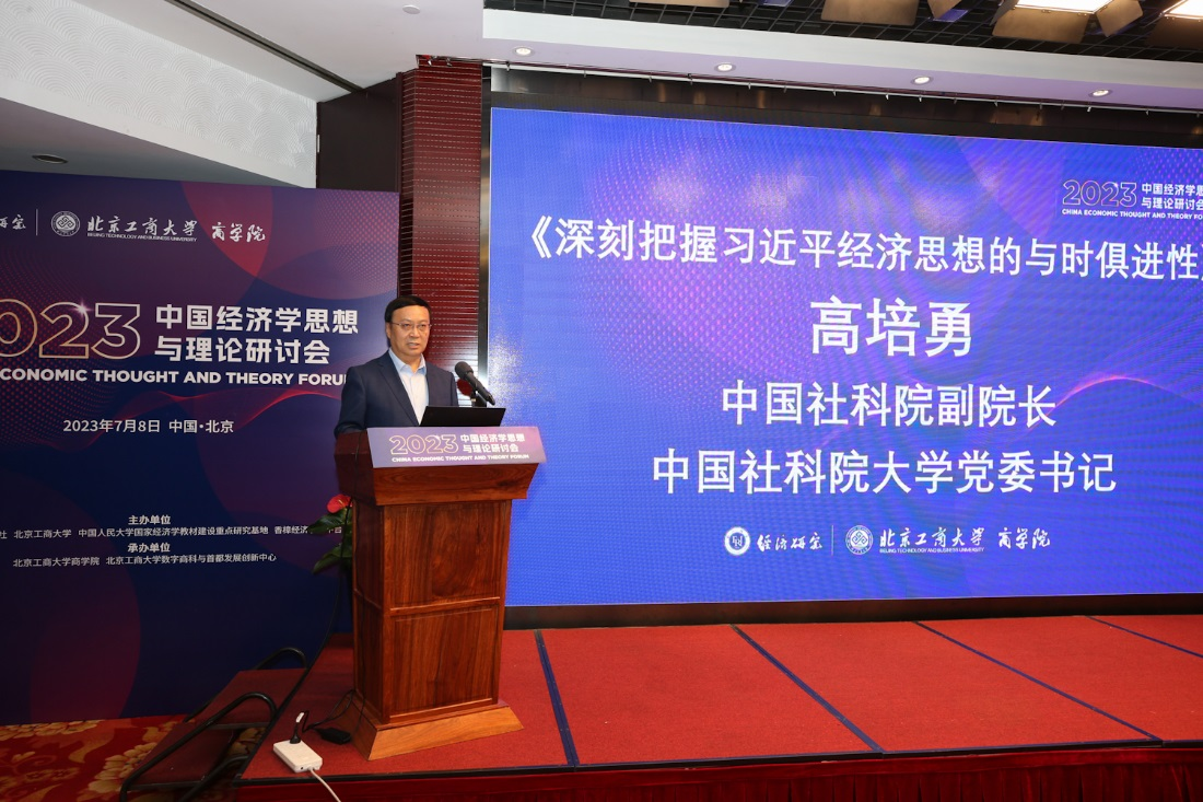 開(kāi)幕式上,黨委副書(shū)記、校長(zhǎng)郭建華教授在致辭中對(duì)各位參會(huì)的專家和代表表示熱烈歡迎和感謝。他指出,經(jīng)濟(jì)建設(shè)是黨和國(guó)家的中心工作。黨的十八大以來(lái),習(xí)近平總書(shū)記深入洞察中國(guó)的具體國(guó)情和經(jīng)濟(jì)發(fā)展實(shí)踐,提出了經(jīng)濟(jì)發(fā)展的一系列重大論斷,科學(xué)總結(jié)了經(jīng)濟(jì)發(fā)展的歷史規(guī)律,形成和發(fā)展了習(xí)近平經(jīng)濟(jì)思想,具有重大的理論和現(xiàn)實(shí)意義。深度挖掘習(xí)近平經(jīng)濟(jì)思想的精髓,更好解讀中國(guó)特色社會(huì)主義建設(shè),服務(wù)我國(guó)改革開(kāi)放和中國(guó)式現(xiàn)代化建設(shè)的大局,為中國(guó)經(jīng)濟(jì)建設(shè)奠定更深厚的理論基礎(chǔ)和科學(xué)指導(dǎo),是每一位經(jīng)濟(jì)學(xué)人的責(zé)任和使命。郭建華表示,北京工商大學(xué)是新中國(guó)成立后中央批準(zhǔn)創(chuàng)辦的第一所商科學(xué)校,是北京市重點(diǎn)建設(shè)的高水平研究型大學(xué)。站在新的歷史起點(diǎn)上,學(xué)校明確以建設(shè)具有商科、輕工和食品特色的高水平研究型大學(xué)為發(fā)展目標(biāo),堅(jiān)定不移地走“商科做強(qiáng)、工科做精、工商融合、雙輪驅(qū)動(dòng)”的內(nèi)涵式發(fā)展道路,主動(dòng)服務(wù)國(guó)家、區(qū)域和行業(yè)發(fā)展,為國(guó)家相關(guān)規(guī)劃政策制定及首都經(jīng)濟(jì)社會(huì)發(fā)展貢獻(xiàn)智慧。郭建華校長(zhǎng)希望各位專家、學(xué)者群策群力、分享智慧,為中國(guó)經(jīng)濟(jì)學(xué)思想理論創(chuàng)新、中國(guó)式現(xiàn)代化實(shí)踐創(chuàng)新建言獻(xiàn)策,使本次會(huì)議成為引領(lǐng)中國(guó)經(jīng)濟(jì)學(xué)思想與理論前行方向的盛會(huì)。