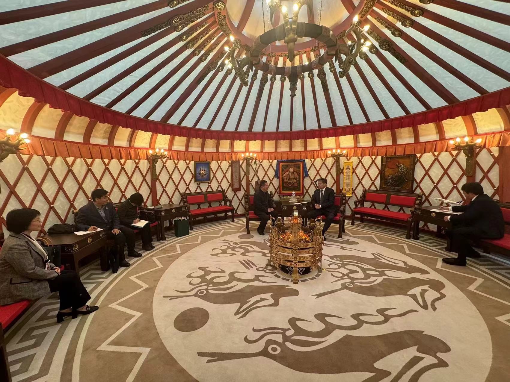 3月27日,學校黨委常委、副校長劉敏華訪問蒙古國駐華大使館,拜訪了蒙古國駐華大使館大使圖·巴德爾勒(Tuvshin Badral)。蒙古國駐華大使館參贊兼總領事巴圖?歐爾士赫、教育參贊滿都呼參加了此次會見。