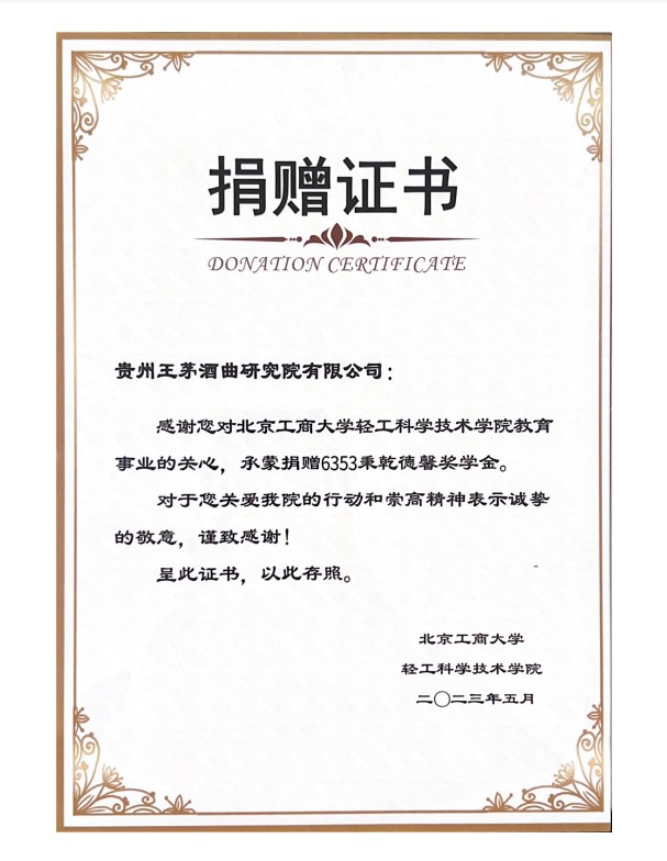 為貫徹國發2號文件關于“支持赤水河流域等創新生態產品價值實現機制”的指示精神,強化產學研結合創新,助力培養更多的釀酒及酒曲研究專業人才,貴州王茅酒曲研究院向北京工商大學教育基金會捐贈9萬元,設立“6353秉乾德馨獎學金”,表彰北京工商大學全日制大學本科學生15名和全日制碩士及博士研究生10名。