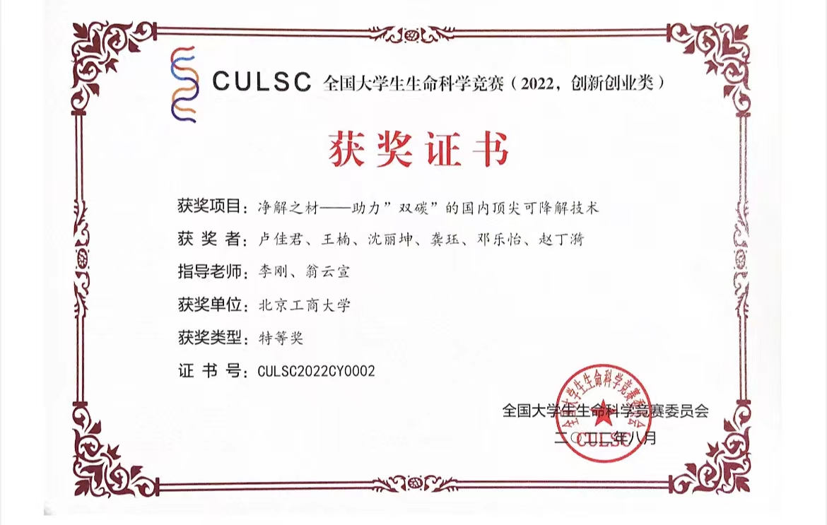 第七屆生命科學創新創業競賽全國總決賽入圍項目共555項,其中創新類315項,創業類240項,由我校人工智能學院副院長李剛副教授和化學與材料工程學院院長翁云宣教授指導,盧佳君、王楠、沈麗坤、龔玨、鄧樂怡、趙丁漪等學生負責的項目《凈解之材——助力“雙碳”的國內頂尖可降解技術》榮獲國家級特等獎的獎項。
