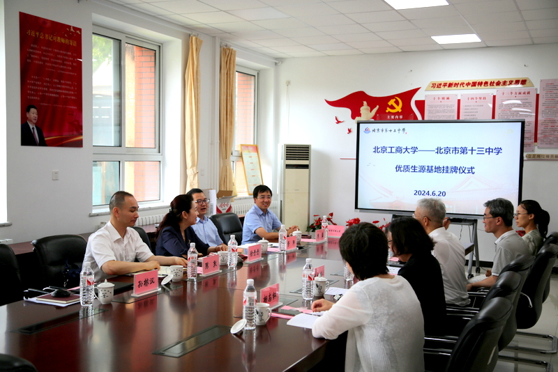北京市第十三中學坐落在中軸線北端、大運河源頭的什剎海地區,是一所完全中學。高中部校區曾是康熙時期的“愉郡王”府、光緒時期的“濤貝勒”府,現今完好地保存著約3400平方米的古建筑,王府原貌猶存,風采如故。前身“私立北平輔仁大學附屬男子中學”成立于1929年,由著名教育家、輔仁大學校長陳垣先生兼任附中首任校長。目前獲得全國綠色學校、全國環境教育先進單位、奧林匹克教育示范校、北京市示范性普通高中、北京市中小學思想政治理論課首批示范基地、北京市首批多樣化特色發展科技教育協作成員校、全國首批健康學校建設單位、西城區首批校本教研基地校和北京市首批人工智能試點學校等稱號。近三年來,北京工商大學共錄取了28位北京市第十三中學優秀學子。本次優質生源基地簽約活動是加強學校本科生招生選才育才的重要舉措,標志著兩校合作邁上了新的臺階,有效增進了彼此之間的相互了解,邁出了在教育資源共享、教育教學改革等方面的新步伐。