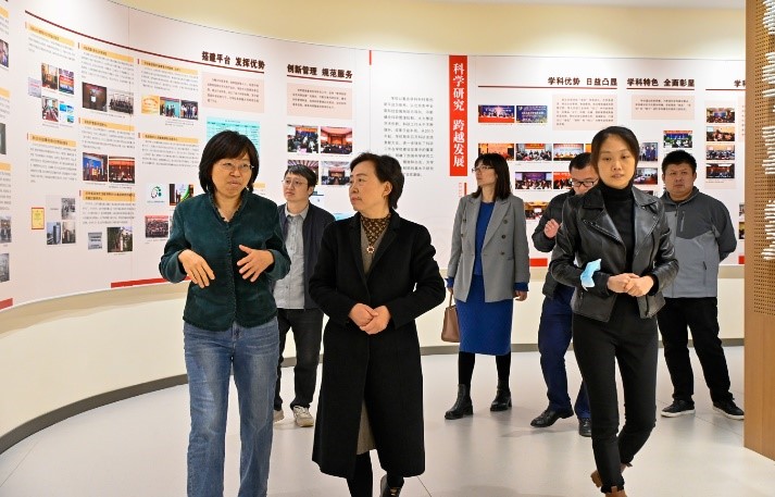 王菁華一行在文二樓、文三樓智慧教室以及數字未來中心現場了解教育教學一體化平臺、知識圖譜子系統、“直錄直播、互聯互通、資源共享”智慧教學環境等數字賦能教育教學建設情況,在中國輕工業釀酒分子工程重點實驗室了解政產學研融合應用情況。在良鄉圖書館和校史館了解館藏資源數字化建設情況,走訪參觀視聽空間、光影空間等個性化服務育人場所。