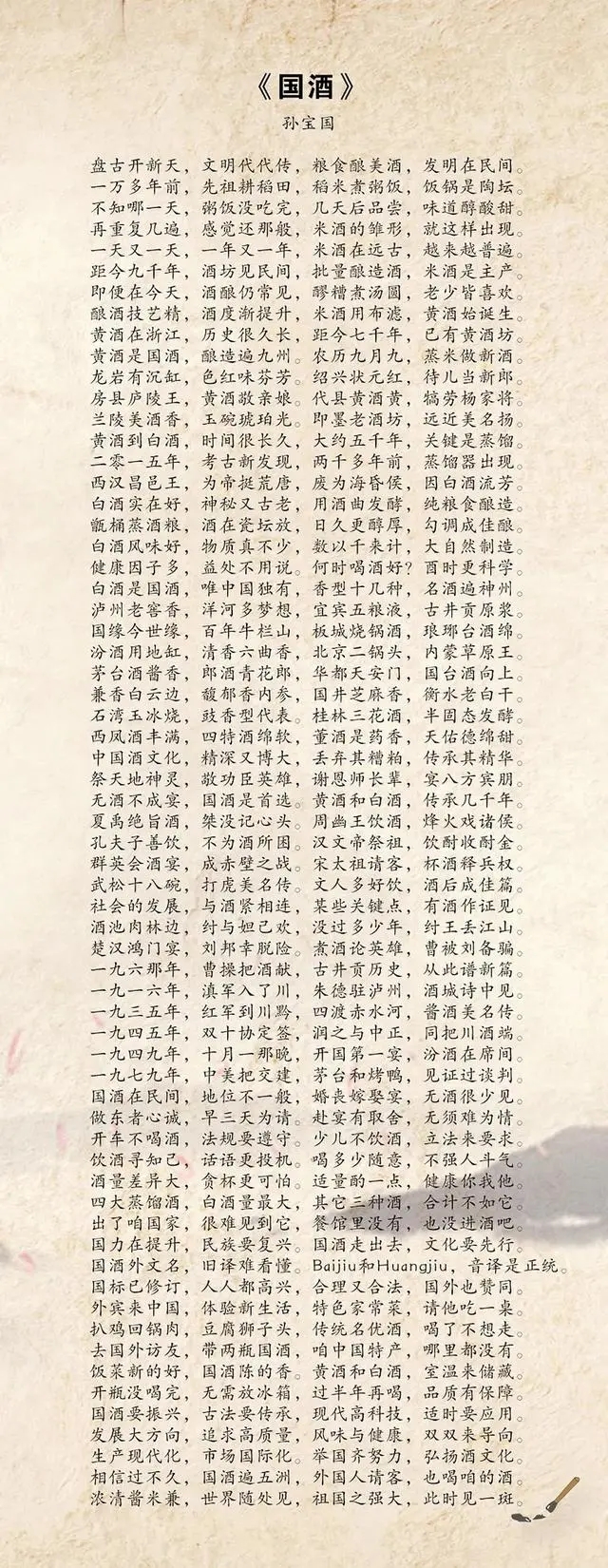 孫寶國曾說:“想寫這樣一首科普詩是因為公眾很難也不必成為白酒專家,希望這樣一首詩,能使大家用最短的時間對中國酒有一個客觀的認識。”可以說,正是他的《國酒》書與詩歌,向世人科普正確的白酒知識,講好中國白酒故事,成為新時代下中國酒文化傳播的成功案例。