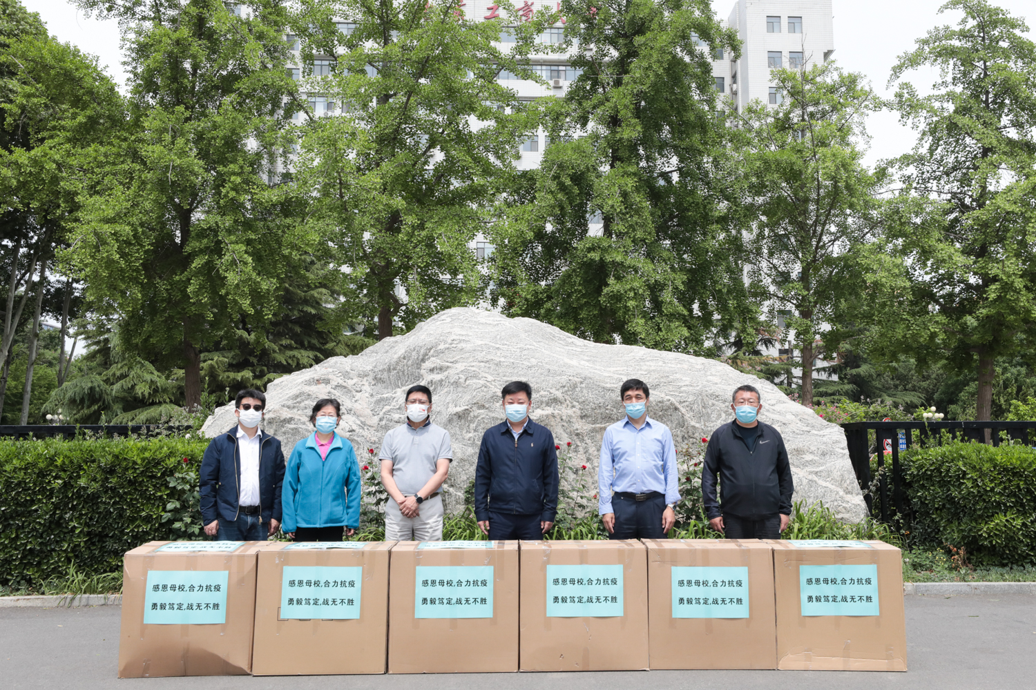 鑒于當前校園疫情防控需要,捐贈儀式從簡。工作人員對捐贈物資進行了全面消殺,從學校物資轉(zhuǎn)運專用通道運至指定地點,并及時送到食堂、物業(yè)、維修、保潔、保安等相關(guān)人員手中。收到物資后,紛紛表示“感謝校友,感謝企業(yè)”“這是對我們的關(guān)心,更是極大的鼓舞”“相信一定能夠戰(zhàn)勝疫情”……